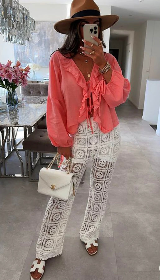 KARRIE FRILL FRONT TIE-UP BLOUSE SHIRT TOP-CORAL
